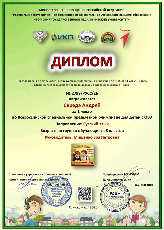Обучающийся 8 класса принял участие во Всероссийской специальной предметной олимпиаде по русскому языку для детей с ОВЗ. По результатам прохождения олимпиады обучающийся награждён Дипломом за 1 место.