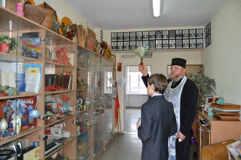 После освящения Сада памяти Отец Павел освятил учебные кабинеты и рабочие помещения школы.