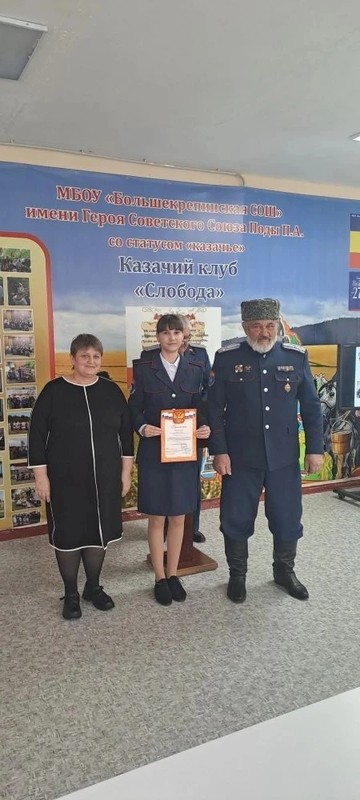 17 февраля на базе МБОУ Большекрепинской СОШ имени Героя Советского Союза Пода П.А. состоялась первая межрайонная научно- практическая конференция " Великая Отечественная война в истории Донского края : поиск, события, источники, память", посвященные Году казачьей истории и культуры. Учащаяся 10 класса Чепурных Мария стала победителем в номинации: "Семейная память о военном лихолетье".