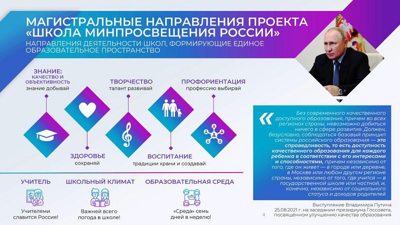 Проект «Школа Минпросвещения России»: единое образовательное пространство для каждого ученика страны. Проект «Школа Минпросвещения России» является механизмом реализации базового принципа системы российского образования, сформулированного Президентом Российской Федерации В. В. Путиным: «...справедливость, то есть доступность качественного образования для каждого ребенка в соответствии с его интересами и способностями, причем независимо от того, где он живет – в городе или деревне, в Москве или любом другом регионе страны, независимо от того, где учится – в государственной школе или частной, и, конечно, независимо от социального статуса и доходов родителей» (заседание президиума Государственного Совета по вопросу о задачах субъектов Российской Федерации в сфере общего образования 25 августа 2021 г.). Проект направлен на реализацию Указа Президента Российской Федерации от 21 июля 2020 г. № 474 «О национальных целях развития Российской Федерации на период до 2030 года», на достижение целей, целевых показателей и результатов национального проекта «Образование».