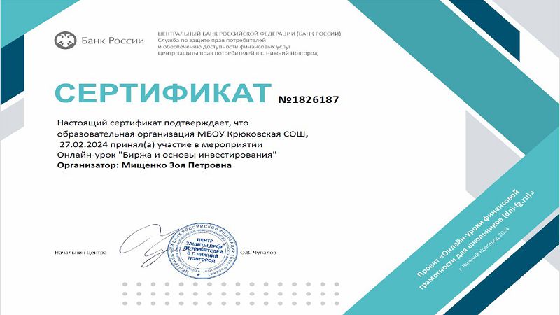 27.02.2024 г. в рамках весенней сессии «Онлайн-уроки финансовой грамотности для школьников» обучающиеся 8 класса МБОУ Крюковской СОШ приняли участие в онлайн-уроке «Биржа и основы инвестирования».