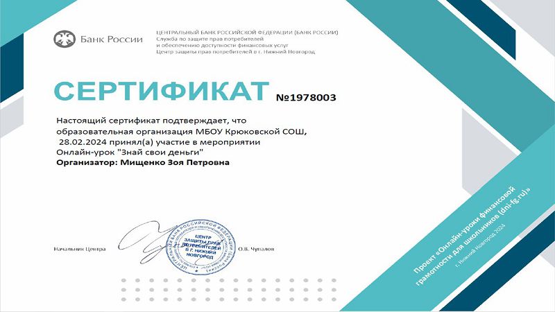 28.02.2024 г. в рамках весенней сессии «Онлайн-уроки финансовой грамотности для школьников» обучающиеся 8 класса МБОУ Крюковской СОШ приняли участие в онлайн-уроке «Знай свои деньги».