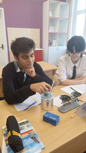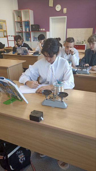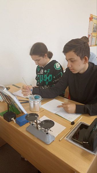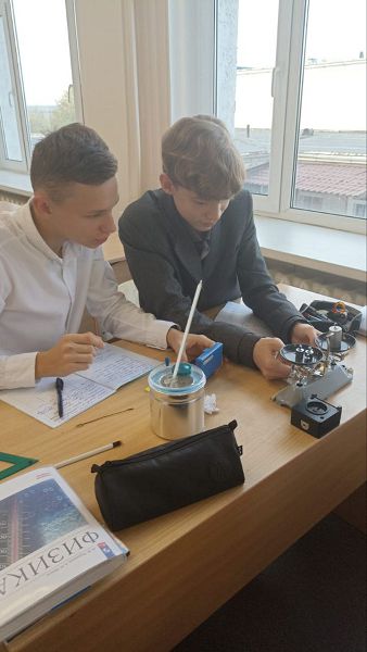Им пришлось вспомнить правила взвешивания на рычажных весах, а так же применить полученные знания измерения температуры вещества и использования калориметра. Путём прямых измерений с учётом абсолютной погрешности, учащиеся рассчитали удельную теплоёмкость цилиндров и сравнили полученный результат с табличным. Своей работой ребята остались довольны.