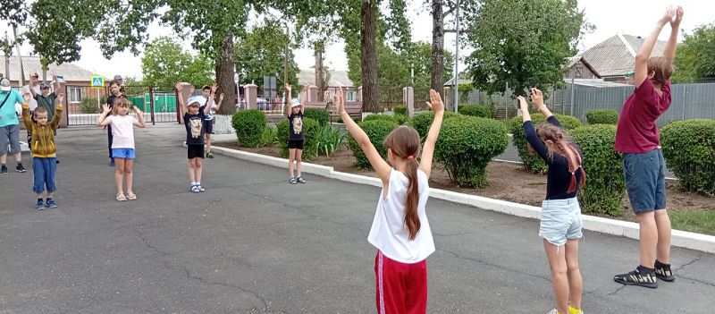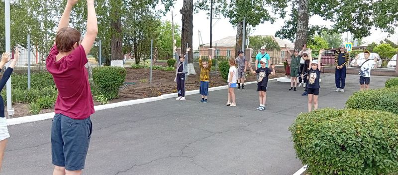 Утренняя зарядка в пришкольном лагере " Улыбка" МБОУ Крюковской СОШ.