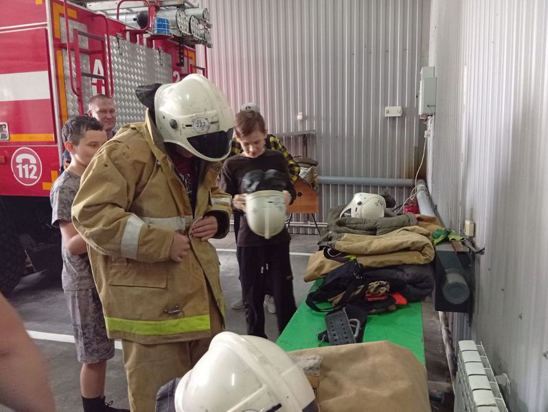 Даже девчонкам было интересно примерить боевую одежду. Ребятам рассказали об имеющихся в распоряжении пожарной части пожарных автомобилях, для каких работ они предназначены, как они работают, чем оборудованы.
