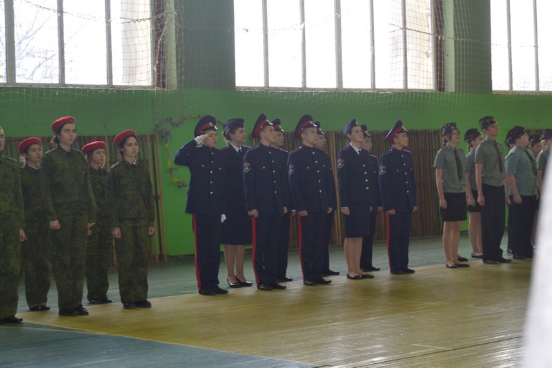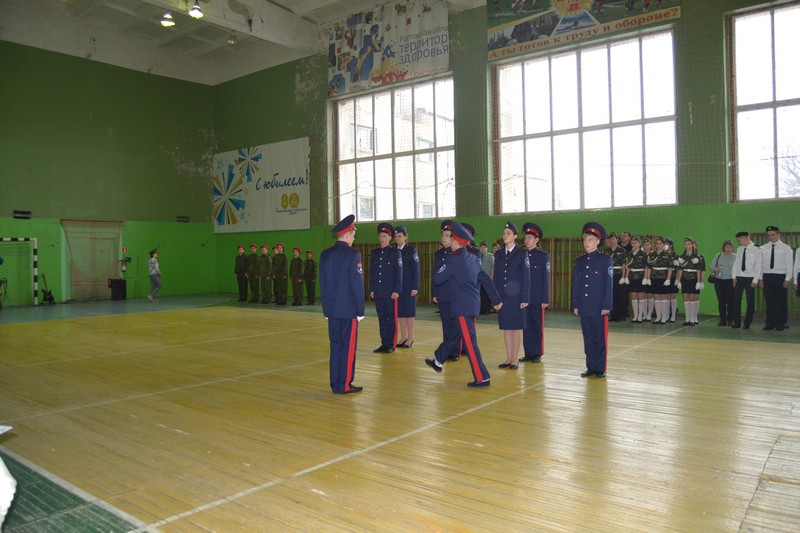 В состав жюри вошли представители Юртового казачьего общества "Куйбышевский юрт" Окружного казачьего общества Таганрогский округ войскового казачьего общества "Всевеликое войско Донское". 20 февраля на районном смотре нашу школу представлял сборный отряд кадетов 8-11 классов.