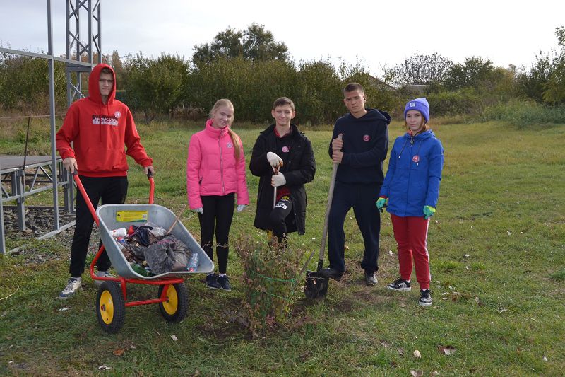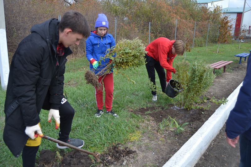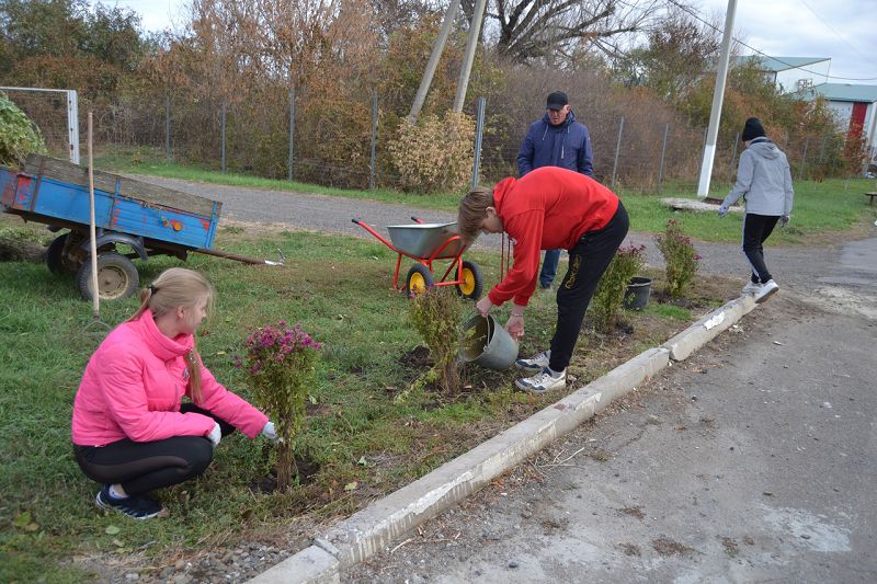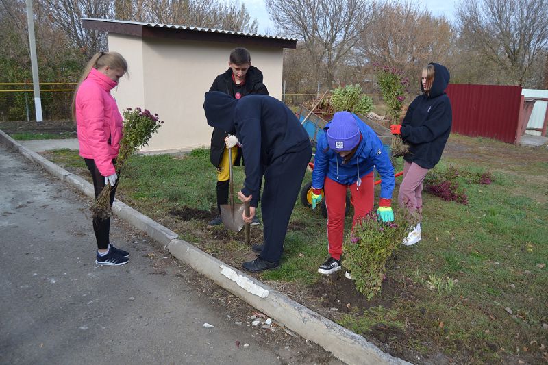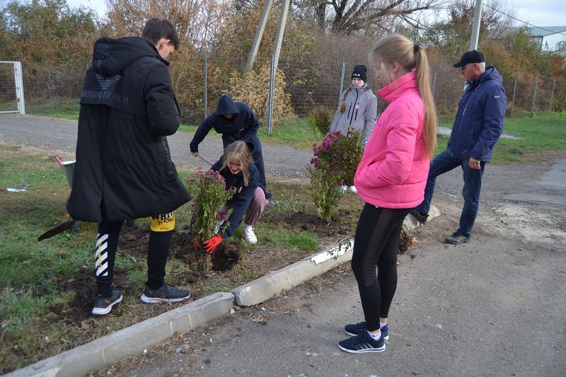 Ребята высадили кустарники барбариса в сквере хутора Крюково и озеленили школьный двор кустами хризантем.