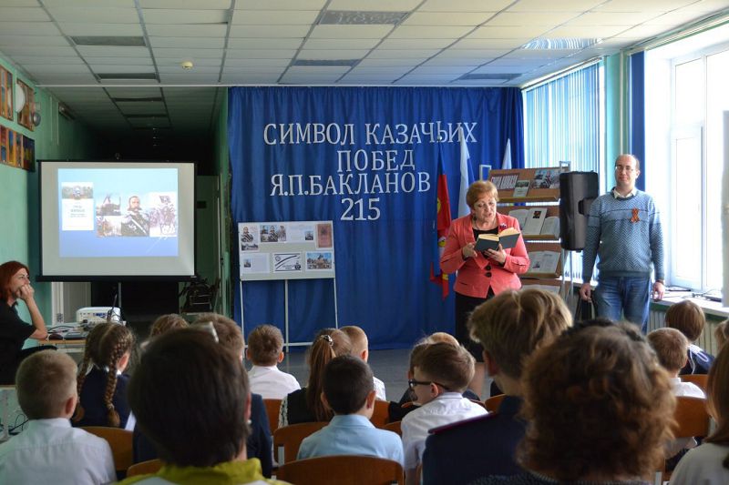 Науменко Е.В. рассказала учащимся о кадетском училище имени Бакланова, которое находится в г. Шахты. В заключении ансамбль " Надежда" под руководством Тюленевой Е.Н. исполнил казачью песню. Встречи с работниками библиотеки в нашей школе стали традиционными и помогают прививать учащимся школы патриотические традиции казачества.